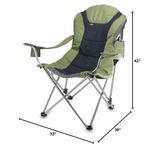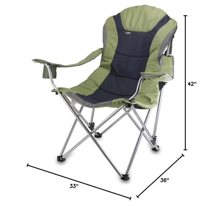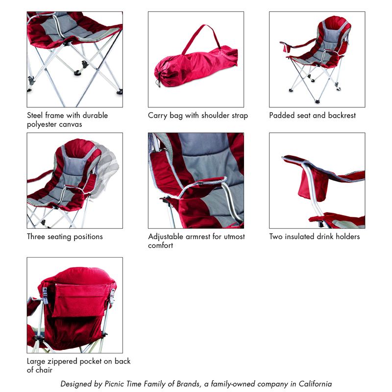 Picnic Time Reclining Camp Chair. The Reclining Camp Chair is no ordinary camp chair. It features a folding steel frame that can hold up to 300 lbs., padded seat and back rest covered in durable 600D polyester canvas, 3 seating positions, adjustable armrests, an insulated drink holder in the right armrest, a large zippered pocket on back of chair, and a matching storage tote with carrying strap. The Reclining Camp Chair is great as a spectator chair at sporting events or for outdoor activities such as lounging by the lake or beach, camping and fishing. But consider yourself warned...once you sit in this chair, you may never want to leave it! Materials: Polyester, steel frame. Dimensions: 36" L x 33" W x 42" H Weight: 11.5 lbs