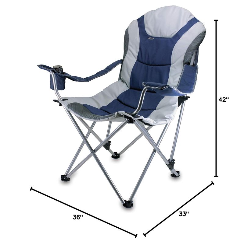 Picnic Time Reclining Camp Chair. The Reclining Camp Chair is no ordinary camp chair. It features a folding steel frame that can hold up to 300 lbs., padded seat and back rest covered in durable 600D polyester canvas, 3 seating positions, adjustable armrests, an insulated drink holder in the right armrest, a large zippered pocket on back of chair, and a matching storage tote with carrying strap. The Reclining Camp Chair is great as a spectator chair at sporting events or for outdoor activities such as lounging by the lake or beach, camping and fishing. But consider yourself warned...once you sit in this chair, you may never want to leave it! Materials: Polyester, steel frame. Dimensions: 36" L x 33" W x 42" H Weight: 11.5 lbs