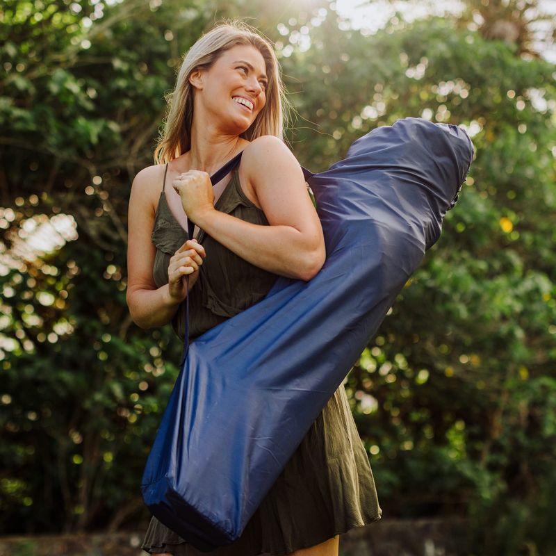 Portátil: el marco de acero resistente de esta silla plegable para exteriores se pliega hacia adentro para caber en una bolsa de transporte con cordón con correa de transporte para una fácil portabilidad sobre la marcha