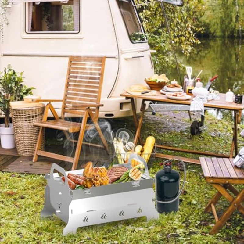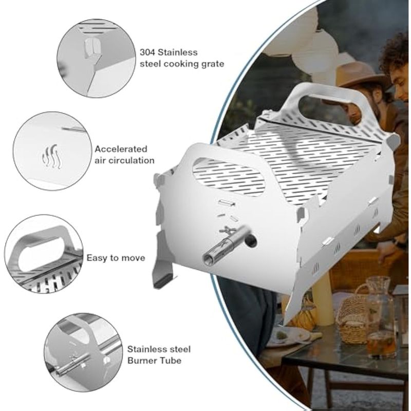Parrilla portátil para barbacoa: esta parrilla desmontable es fácil de montar y está diseñada para caber perfectamente en tu mochila o bolsa de viaje. Con cómodas asas, puedes moverlo sin esfuerzo por tu patio trasero o llevarlo a aventuras al aire libre con facilidad.