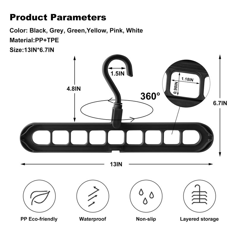 El ahorrador de espacio para colgar tiene múltiples formas de colgar, y su gancho se puede girar 360 & # x02013. Cuando el organizador de cierre se cuelga vertical o verticalmente, puede ahorrar el 80 del espacio en el armario. Cuando las perchas plegables se cuelgan horizontalmente, es adecuado para secar. Las perchas de dormitorio con diseño isométrico de nueve agujeros hacen que la ropa sea uniformemente ligera y mejor ventilación y secado.