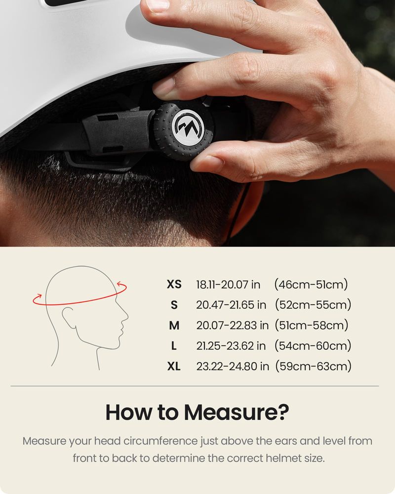 ¿Cómo medir un casco adecuado? - Para encontrar el casco de bicicleta del tamaño correcto, comienza midiendo la circunferencia de tu cabeza, envuelve una cinta métrica flexible alrededor de la parte más grande de tu cabeza: aproximadamente una pulgada por encima de tus cejas. O bien, envuelva una cuerda alrededor de su cabeza, luego mida la longitud de la cuerda con una varilla. Se recomienda la talla L si tu talla está entre 21.3-22.8 pulgadas. La clasificación de edad recomendada: 5 años o más