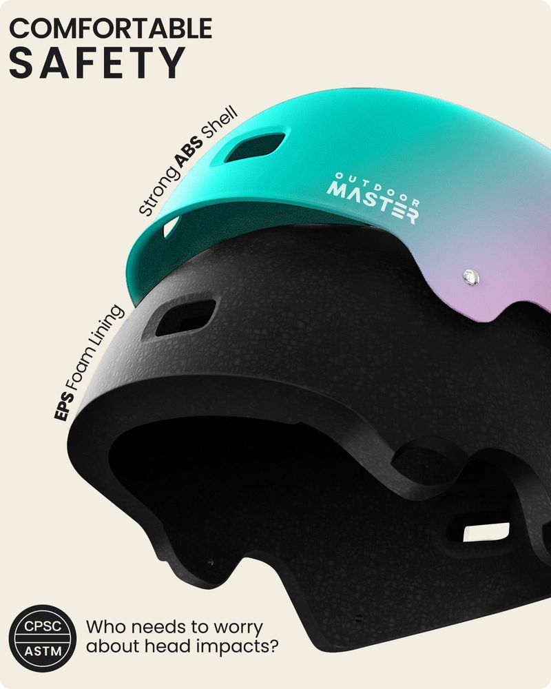 MAX PROTECTION?OutdoorMaster skateboard Helmet-Beetles Snug with Hard and fully formed ABS surrounds high quality EPS foam to absorb shock and keep you riding safely in this Outdoormaster helmet as you ride on your bicycles, skateboards, roller skates and scooters. Built for both comfort and impact.