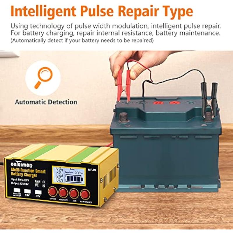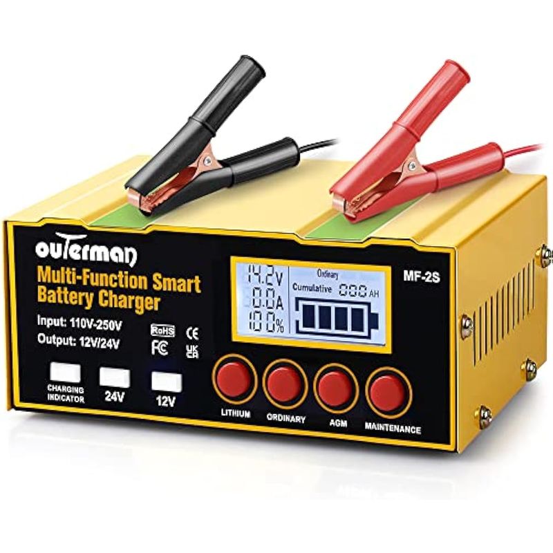 OUTERMAN CARGADOR DE BATERíA DE AUTOMóVIL, CARGADOR DE BATERíA DE LITIO DE 12 V/12 A, 24 V/7.5 A, MANTENEDOR INTELIGENTE DE GOTEO AUTOMáTICO MEJORADO CON PANTALLA LCD, 4 MODOS DE CARGA PARA BATERíA DE PLOMO AGM, AUTOMóVIL, BARCO, MOTOCICLETA Y MáS