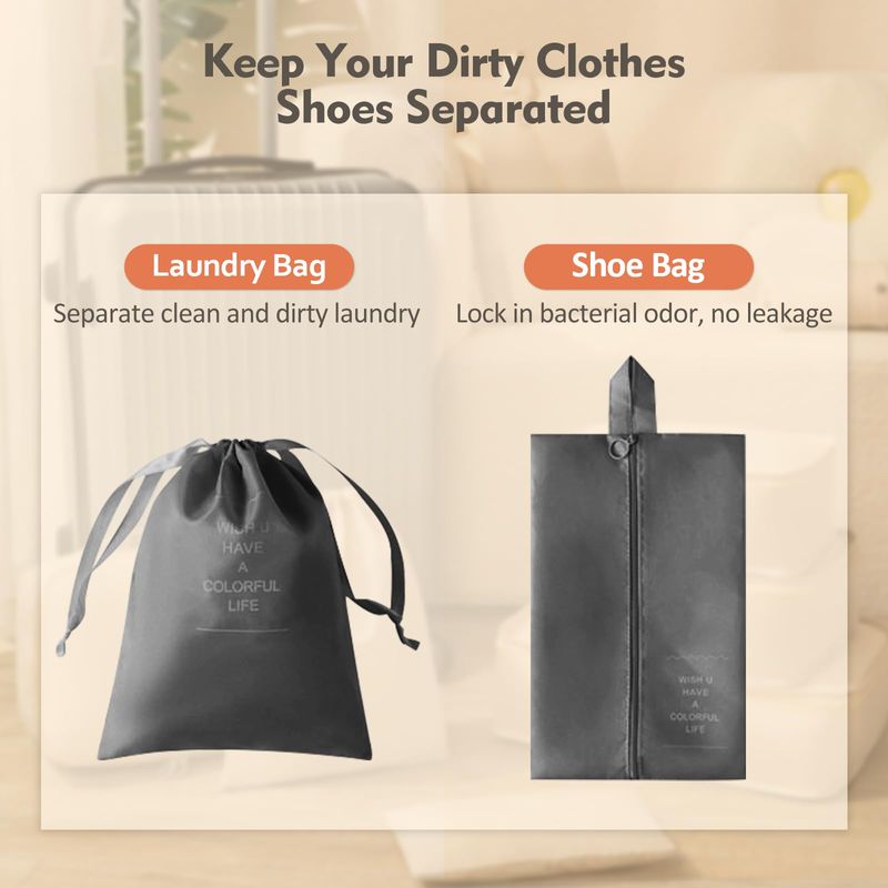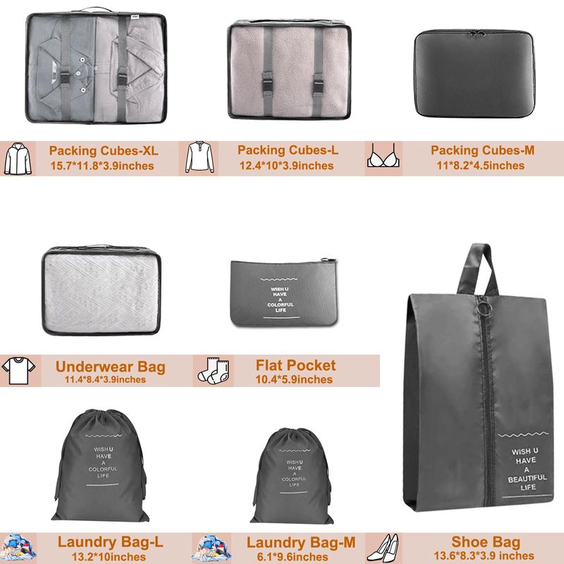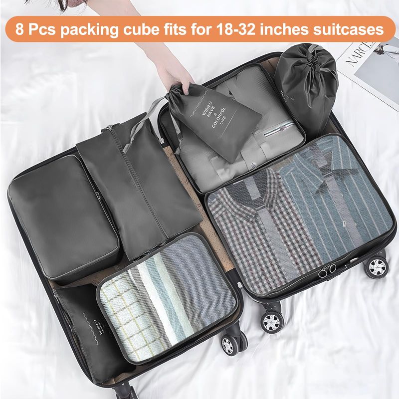 Travel Packing Cubes Set: Our 8 set travel packing cubes include 2 laundry bags, 3 mesh breathable packing cubes 1 large, 1 medium, 1 small 1 underwear packing cube along with a shoe bag, and a flat bag. for essentials like jackets, shirts, trousers, underwear, toiletries, and more.