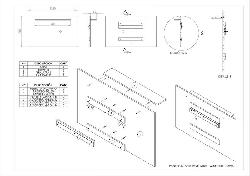 Panel Rack Flotante para TV con Estantes Reversible - 1851