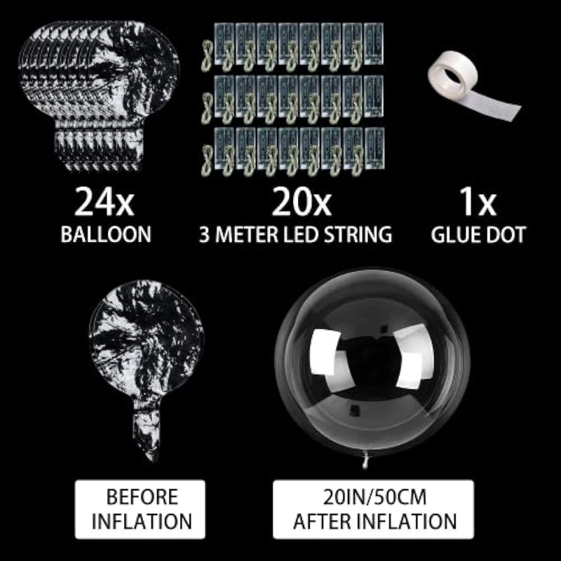 El paquete incluye: 24 globos de 20 pulgadas, 20 luces LED de 10 pies y un punto de pegamento. Los globos se pueden inflar con tanques de helio. Las pilas no están incluidas. Cada globo necesita 2 pilas AA