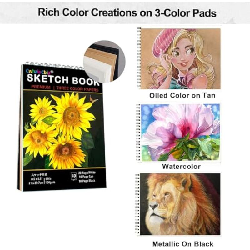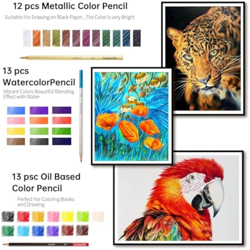 Suministros de dibujo profesionales: este kit de libro de sketh viene con 12 lápices de dibujo de grafito, 12 lápices de color negro carbón 2H, 3H, 4H, 5H, HB, 2B, 3B, 4B, 5B, 6B, 8B, 12 lápices de colores a base de aceite, 12 lápices metálicos, 12 lápices de acuarela, 1 lápiz de grafito blanco. Amplia gama y colores brillantes permite probar diferentes estilos de dibujo.