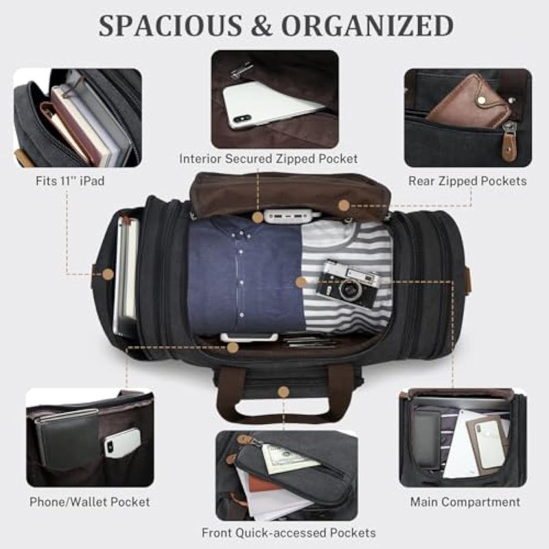 ?Múltiples bolsillos y gran capacidad? interior con 1 compartimento principal grande y 1 bolsillo con cremallera. Exterior con 2 bolsillos laterales con cremallera, 2 bolsillos delanteros con cremallera y 1 bolsillo trasero con cremallera. Espacioso con 50 l para sostener portátiles de 15 pulgadas, iPad Air, ropa, zapatos y otros elementos esenciales diarios para viajes de 3 a 4 días