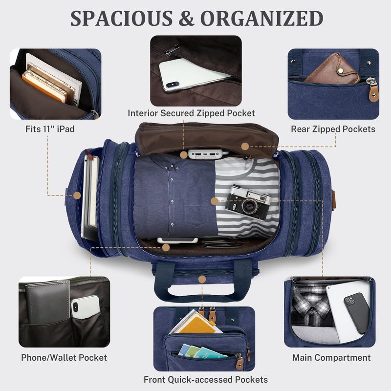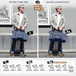 ?Múltiples bolsillos y gran capacidad? interior con 1 compartimento principal grande y 1 bolsillo con cremallera. Exterior con 2 bolsillos laterales con cremallera, 2 bolsillos delanteros con cremallera y 1 bolsillo trasero con cremallera. Espacioso con 50 l para sostener portátiles de 15 pulgadas, iPad Air, ropa, zapatos y otros elementos esenciales diarios para viajes de 3 a 4 días