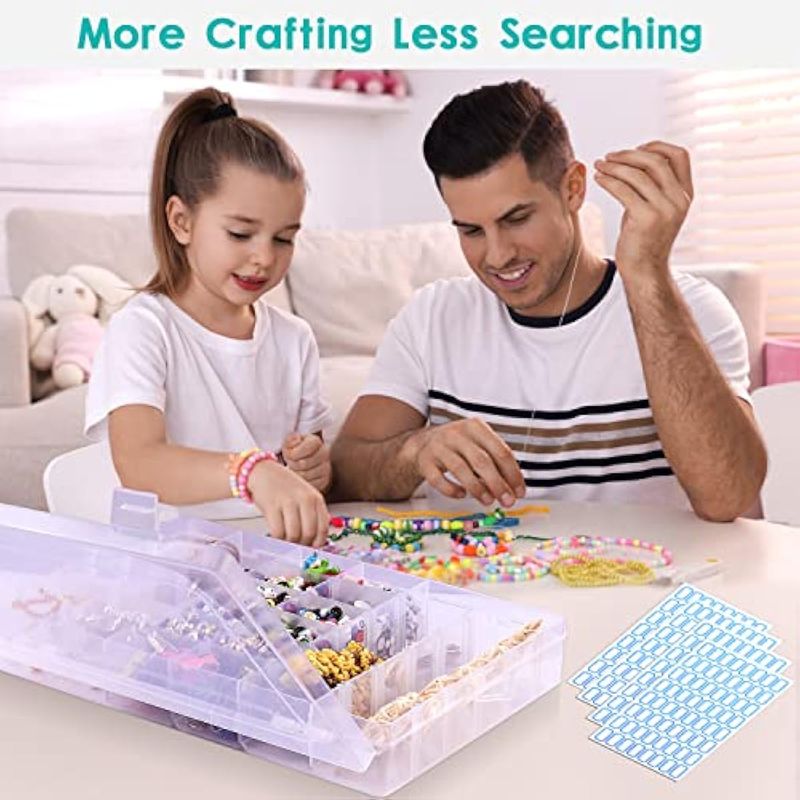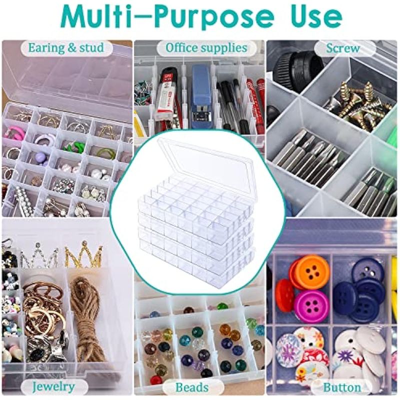 PLMMOUT PAQUETE DE 4 CAJAS ORGANIZADORAS DE PLáSTICO TRANSPARENTE, ORGANIZADOR DE CUENTAS TRANSPARENTES DE 36 REJILLAS CON DIVISOR AJUSTABLE PARA ARTE DE CUENTAS, MANUALIDADES, JOYERíA, PESCA, CON 512 ETIQUETAS ADHESIVAS