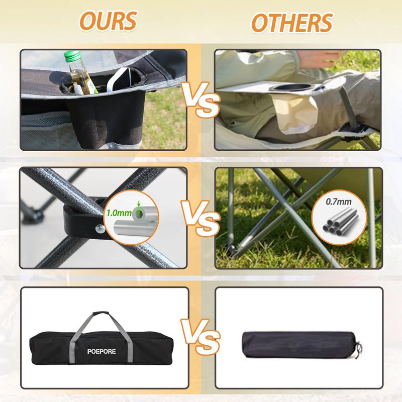 Resistente y duradera: la silla de camping cuenta con un marco de acero inoxidable resistente que puede soportar hasta 264 libras, utilizando tela resistente al desgaste y material de malla transpirable para garantizar que tu cuerpo se mantenga fresco y cómodo.
