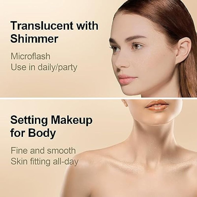 Polvo facial translúcido brillante: el polvo de fijación blanco es un acabado mate con un micro flash. Muestra un ligero efecto brillante a la luz del sol, así como sin flashback al tomar fotos. El polvo translúcido es adecuado para uso diario o fiesta y también se utiliza para el cuerpo.