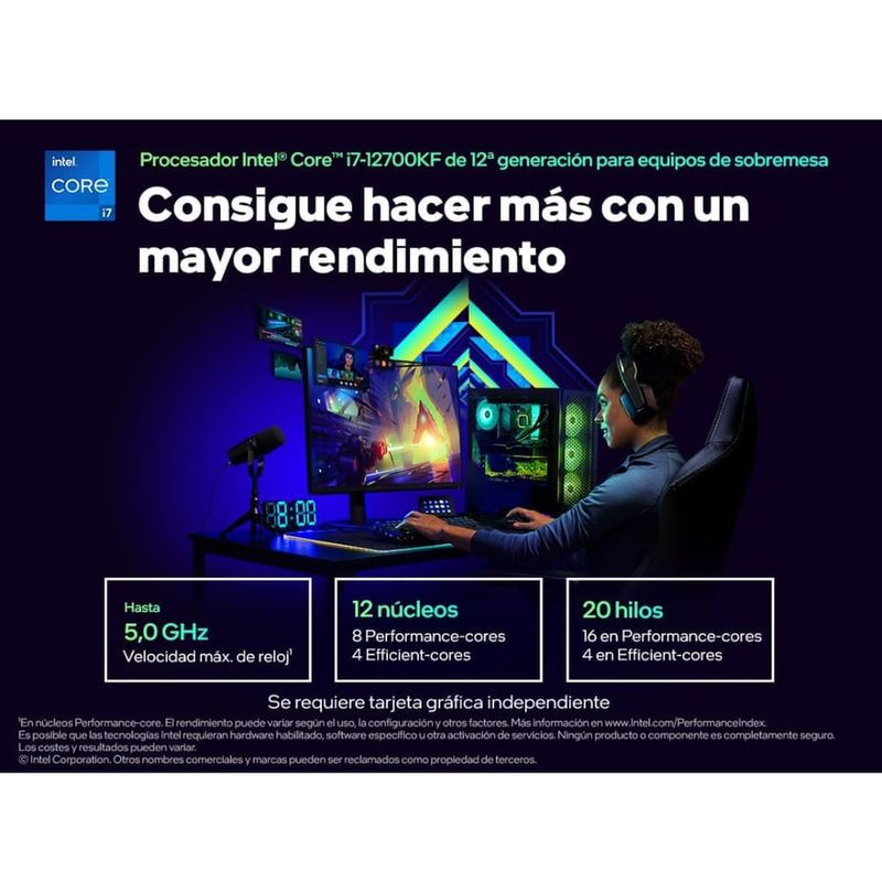 El procesador Intel® Core™ i7-12700KF de 12ª Generación ofrece un rendimiento excepcional para juegos y tareas exigentes, con capacidad de overclocking. Con 12 núcleos (8 Performance-cores y 4 Efficient-cores) y 20 hilos, alcanza velocidades de hasta 5.00 GHz. No incluye gráficos integrados, por lo que requiere una tarjeta gráfica dedicada. Resumen de especificaciones: