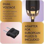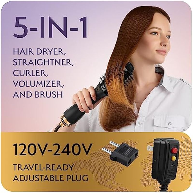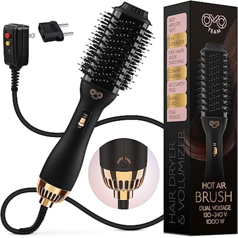 PROFESSIONAL DUAL VOLTAGE BLOWOUT HAIR DRYER BRUSH FOR EUROPEAN TRAVEL 110V-120V/220V-240V, BLACK GOLD DRYER AND VOLUMIZER, HOT AIR BRUSH FOR WOMEN, 2.4 INCHES OVAL SHAPE