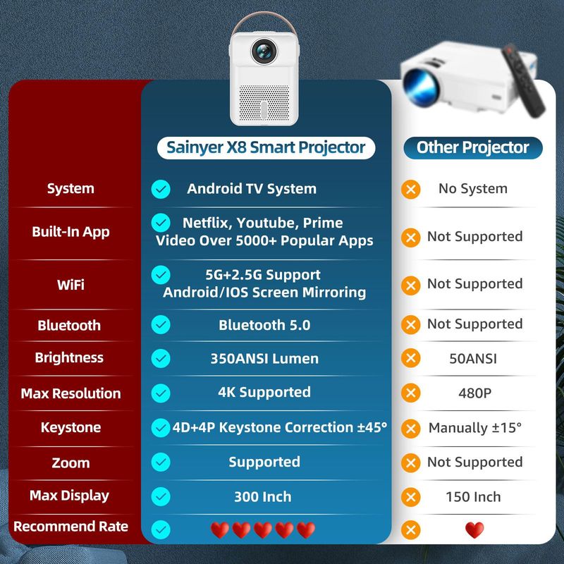 ?????Sistema Android integrado, Youtube, Netflix?Sainyer X8 es el proyector inteligente más nuevo del mercado, no el tradicional más antiguo. El proyector X8 Android OS es más compacto y fácil de acceder a tus películas, programas de televisión y juegos favoritos a través de su sistema Android integrado. A diferencia de los proyectores tradicionales que necesitan la molestia de adaptadores adicionales, el proyector Sainyer X8 puede descargar aplicaciones directamente en el proyector y puedes ver tus videos favoritos sin problemas y más convenientes.