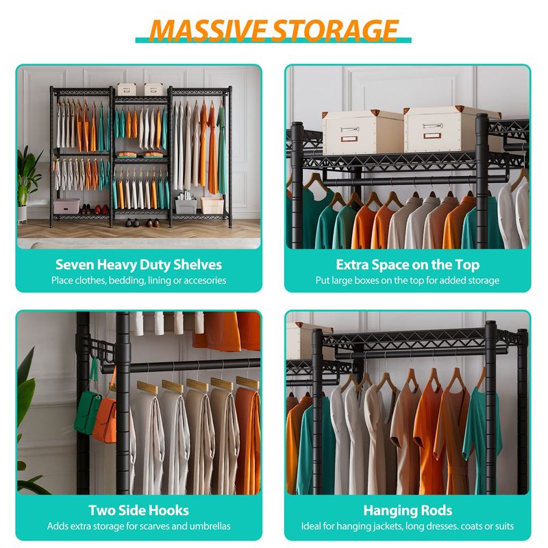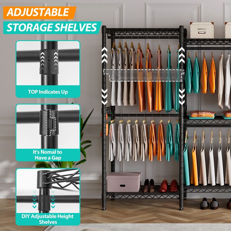 ?Adjustable Metal Clothing Rack?The heavy duty clothes rack has 3 tiers adjustable wire shelving ,1 hanging rods and 1 side hook offers you various storage area. Each shelf can be adjustable, you can adjusted up and down for your needs to store difference sized items, easily maximize your storage space.