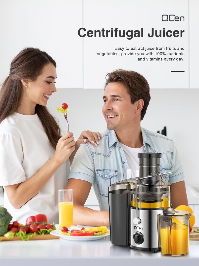 QCEN MáQUINA EXPRIMIDORA, EXTRACTOR DE EXPRIMIDOR CENTRíFUGO DE 500 W CON BOCA ANCHA DE 3 PULGADAS, CANAL DE ALIMENTACIóN PARA FRUTAS Y VERDURAS, FáCIL DE LIMPIAR, ACERO INOXIDABLE, SIN BPA (NEGRO)