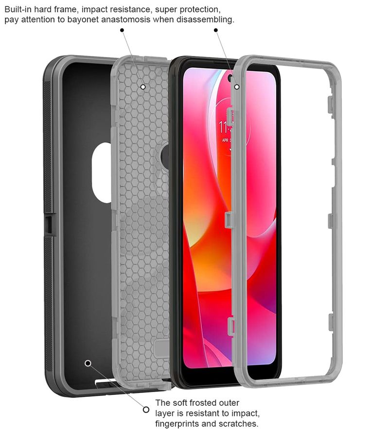 [Grado militar] solo es aplicable al Motorola Moto G Play 2023 con un fuerte marco protector en el interior, y la cubierta trasera está hecha de cojines de goma suave, que pueden evitar eficazmente que el teléfono se caiga, colisiones y lesiones boca arriba o boca abajo.