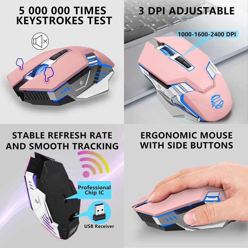 RATóN BLUETOOTH, MOUSE INALáMBRICO PARA JUEGOS, MOUSE SILENCIOSO RECARGABLE DE 800 MAH CON TRES MODOS, BOTONES LATERALES, RETROILUMINACIóN RGB, 2400 DPI, MOUSE ERGONóMICO PARA COMPUTADORA PORTáTIL, PC, MACBOOK PRO/AIR, IPAD, TABLETA, MAC