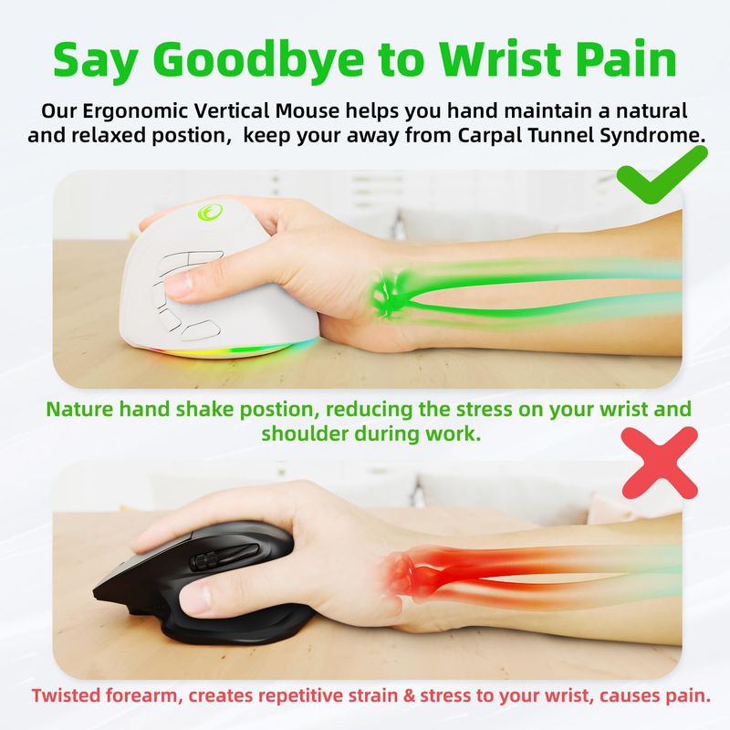 Ratón ergonómico vertical inalámbrico recargable RGB de 2.4G y BT 5.1, 5 botones laterales, máximo