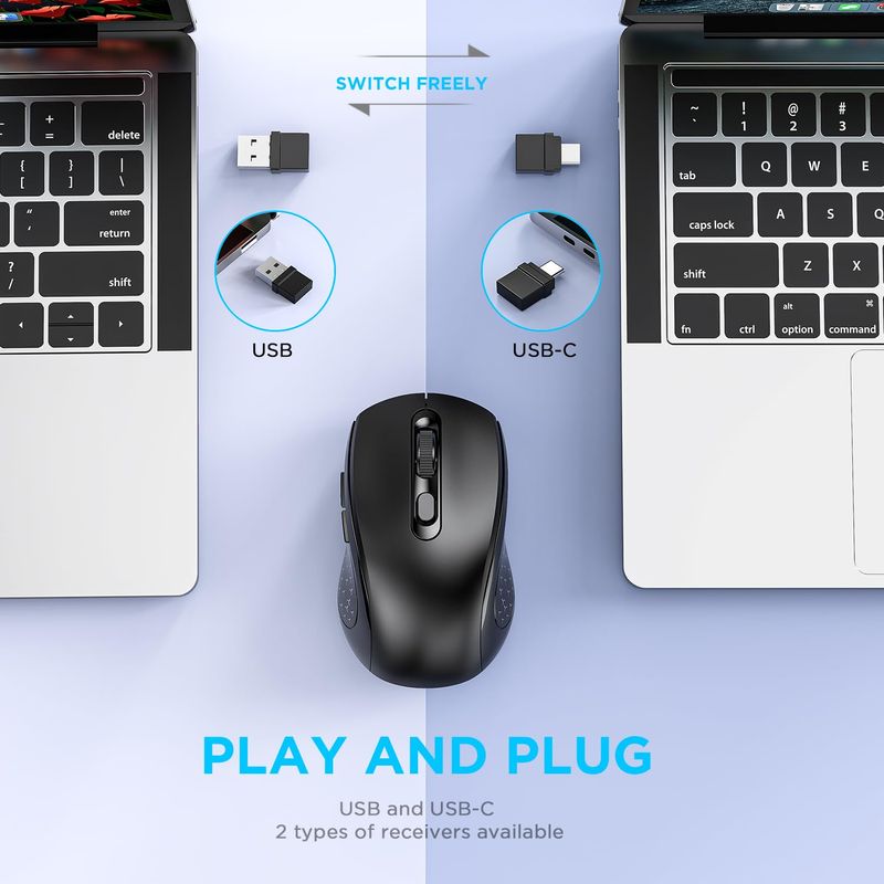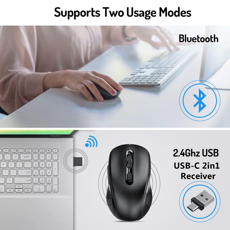 Ratón inalámbrico para computadora con BT5.0, USB-A y USB-C 2 en 1, receptor dual de 6 botones,