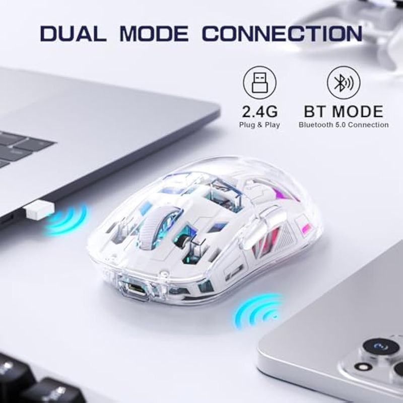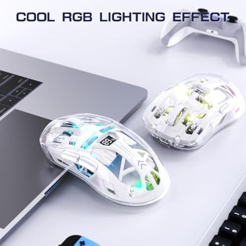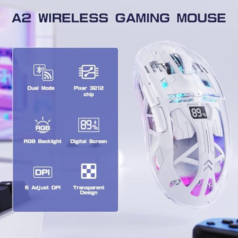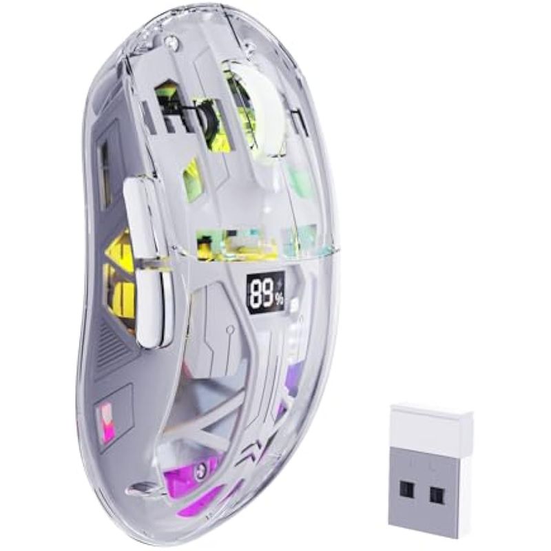 RATóN INALáMBRICO TRANSPARENTE A2 PARA JUEGOS, MODO DUAL BT 5.0/2.4G, RATóN PARA JUEGOS DE PC, PIXART 3212 5 DPI AJUSTABLES, MOUSE SILENCIOSO RECARGABLE CON PANTALLA DIGITAL, MOUSE CON