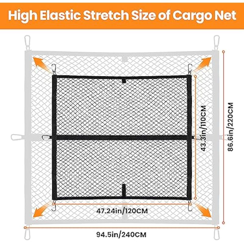 ?Hasta 2 diseños elásticos?La red de carga altamente elástica mide 43 x 47 pulgadas 43.3 x 47.2 in y se puede estirar hasta 86 x 94 pulgadas 86.6 x 94.5 in. La red de almacenamiento del maletero se estira alrededor de tus cosas y puedes meter más cosas que nunca.
