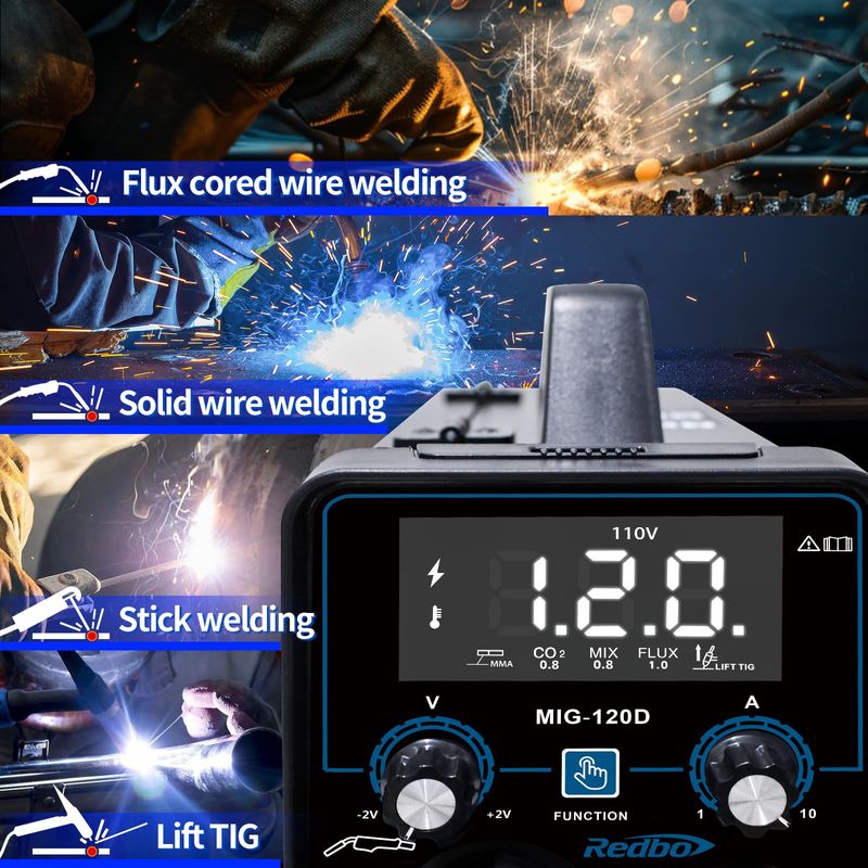 REDBO POTENTE SOLDADOR MIG DE 110/220 V DE DOBLE VOLTAJE DE 160 AMPERIOS, MIG DE GAS, NúCLEO DE FLUJO SIN GAS MIG/STICK/LIFT TIG/SPOOL GUN 5 EN 1 MáQUINA DE SOLDADURA MULTIPROCESO, SOLDADOR MIG CON PANTALLA DIGITAL LED DE ALUMINIO DE SOLDADURA