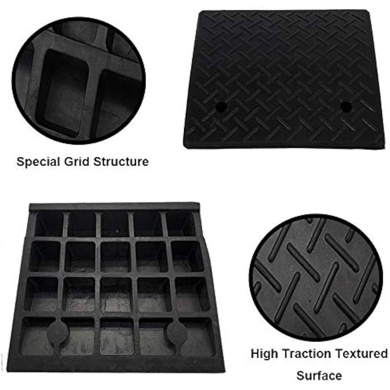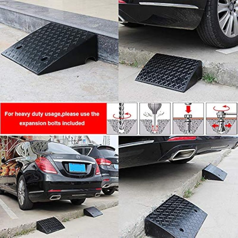 Juego de 2: 2 rampas de goma de grado industrial, cada una mide 16.8 pulgadas de largo x 18.8 pulgadas de ancho x 4.3 pulgadas de alto y pesa 24 libras, incluye 2 agujeros preperforados de 12 pulgada de diámetro con hueco de 1 pulgada para un montaje permanente opcional. El paquete viene con 4 pernos de expansión que te ayudan a instalar. Soporta hasta 22000 libras de peso, lo que permite que los vehículos grandes se conducido con seguridad hacia arriba o abajo en el suelo irregular o en la acera. Combina varias rampas de acera juntas para abarcar mayores longitudes de bordillo para satisfacer tus diferentes necesidades