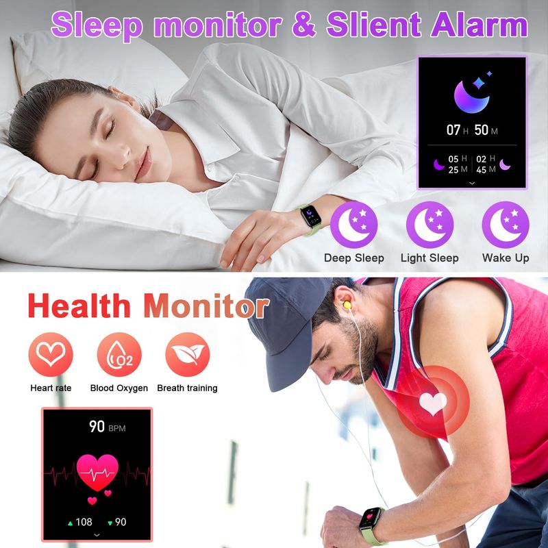 Reloj inteligente con monitor de frecuencia cardíaca: los relojes de salud para hombres y mujeres utilizan sensores ópticos deportivos de alto rendimiento que pueden controlar la frecuencia cardíaca, el oxígeno en sangre Sp02, lo que te ayuda a comprender mejor tu salud y hacer un ajuste razonable a tu estilo de vida. Los relojes inteligentes para hombres y mujeres compatibles con Android y iPhone pueden controlar tu estado de sueño sueño profundo, sueño superficial y proporcionar un análisis completo de la calidad del sueño para ayudar a ser más saludable. El reloj electrónico tiene 2 Correa