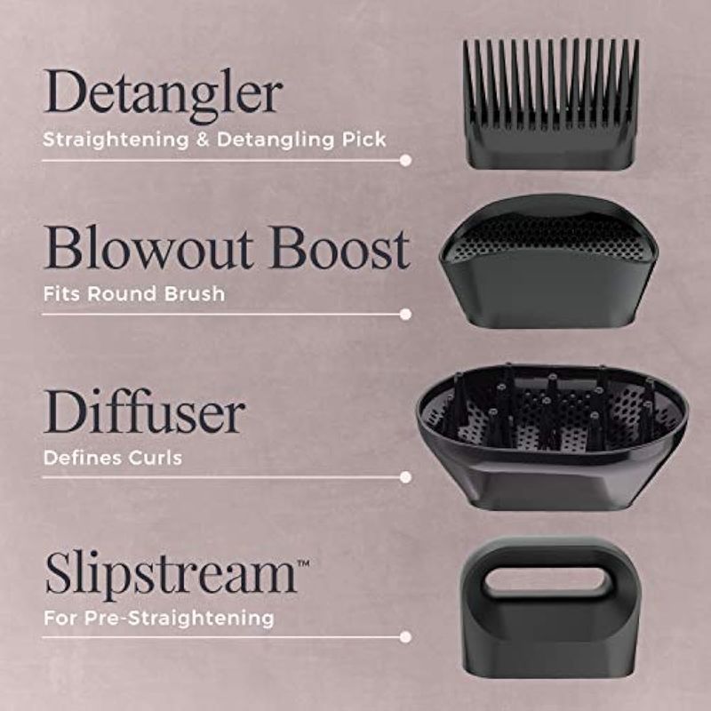 Accesorios innovadores: detallados para alisar y alisar; el refuerzo de soplado funciona con un cepillo redondo; secador de pelo con difusor ayuda a definir rizos; flujo deslizante para enderezar previamente.