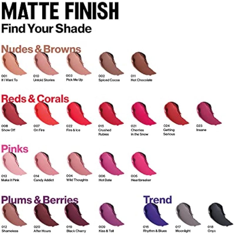 24 tonos mate vibrantes: Desde colores piel, rosas, rojos, marrones y ciruelas, cada uno ofrece un verdadero acabado mate y se siente adictivamente bien en tus labios