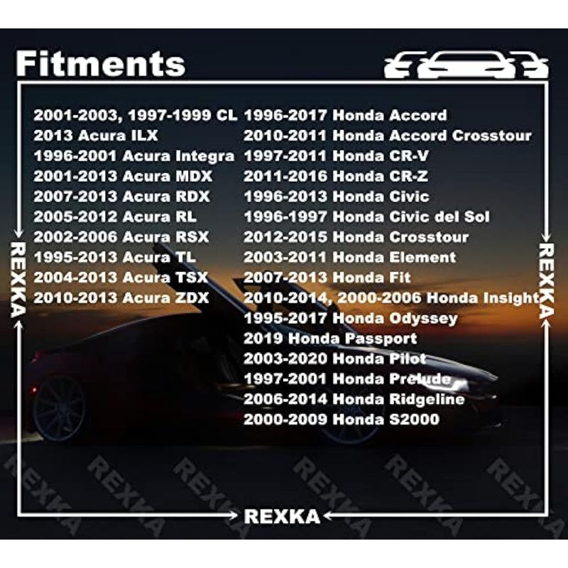 Sustituye a Honda Acura 91501-S04-003. Compatible con Acura CL, ILX, Integra, MDX, RDX, RL, RSX, TL, TSX, ZDX; Honda Accord, Accord Crosstour, Civic, Civic del Sol, CR-V, CR-Z, Crosstour, Element, Fit, Insight, Odyssey, Passport, Pilot, Prelude, Ridgeline, S2000