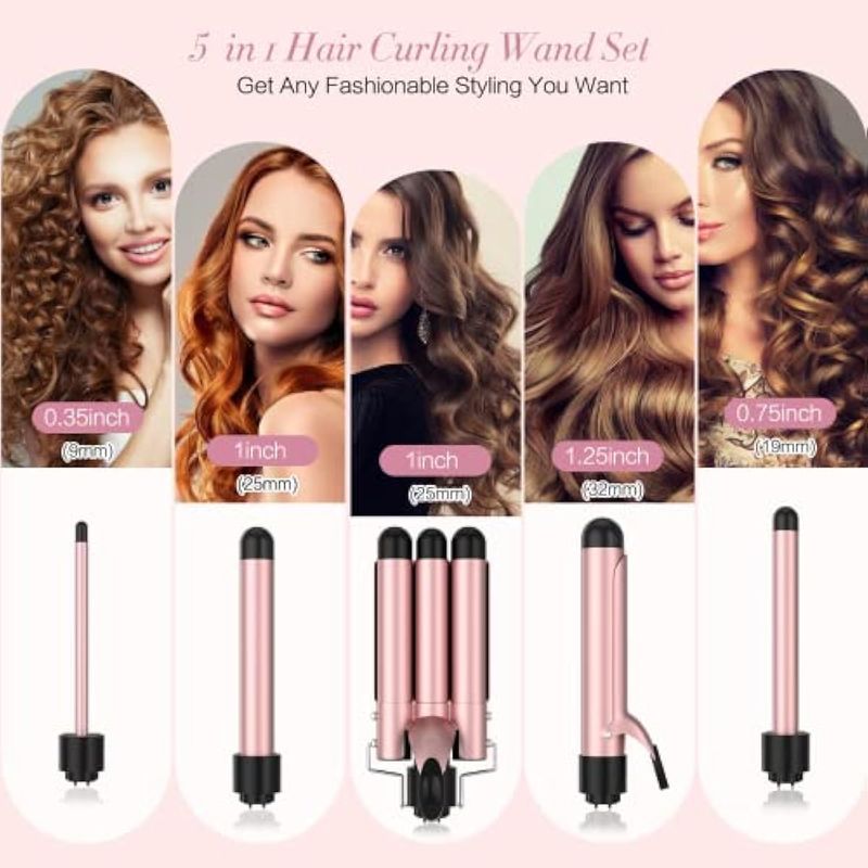 RIZADOR 5 EN 1, JUEGO DE VARITA RIZADORA CON HERRAMIENTA PARA EL PELO Y 4 RIZADORES DE CERáMICA INTERCAMBIABLES (0.35 A 1.25 PULGADAS), 2 TEMPERATURAS, CALENTAMIENTO INSTANTáNEO, INCLUYE GUANTES