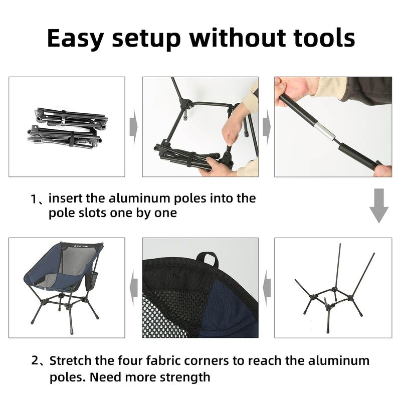 NSTALL EN SEGUNDOS: Sistema de poste de aluminio ligero con conexión de guía manual. El marco principal con cable de choque de la silla plegable te permite guiar los postes conectados directamente al marco. Este diseño único te permite abrirlo, fijar la tela del asiento y ¡ya estás listo! El diseño del anillo de cuerda hace que el proceso de montaje sea más fácil y ahorra mano de obra