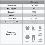 Este equipaje de mano está hecho de plástico ABS. Los principales beneficios de este material: es extremadamente ligero, es duradero y protege el contenido de tu equipaje. Las ruedas giratorias multidireccionales giran 360 grados para una fácil maniobrabilidad. Este equipaje te ofrece más espacio para tus artículos mientras que te evita recargos por exceso de peso impuestos por la mayoría de las aerolíneas. Cuatro ruedas giratorias dobles multidireccionales para una fácil movilidad. Moderno mango telescópico interno cromado con botón. Bolsillo interior de malla y cremallera y bolsillo elástico. Mide 20 x 13 x 9 pulgadas y pesa 7.5 libras. El diseño de la rueda puede variar entre color negro y plateado.