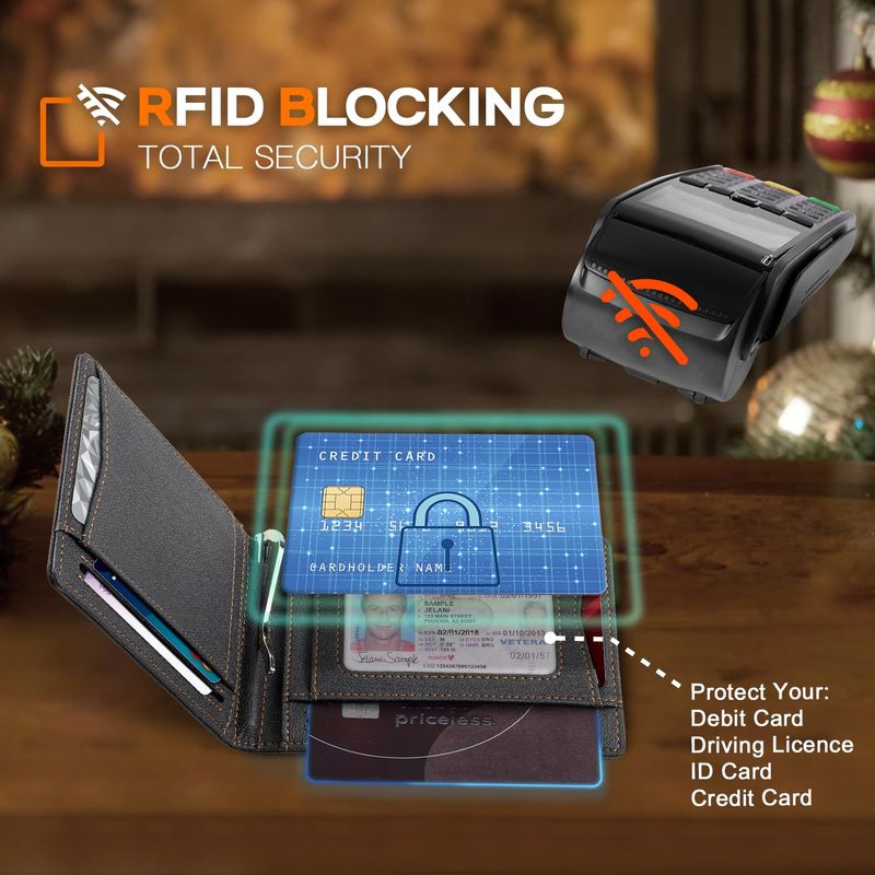 Seguridad. Privacidad. Seguridad: las carteras RUNOBX para hombre están equipadas con tecnología RFID SECURE de Alemania, un compuesto de metal único, diseñado específicamente para bloquear señales RFID de 13.56 MHz o superiores. Proteja su valiosa información almacenada en chips RFID de escaneos no autorizados