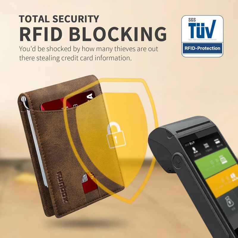 RUNBOX Cartera delgada de cuero genuino para hombre, bloqueo RFID, plegable, minimalista, bolsillo