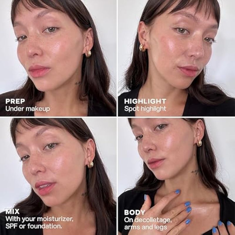 Bienvenido al luminizador más brillante y ligero. Llévalo solo, debajo o mezclado con base o SPF teñido como imprimación iluminadora e hidratante, o úsala sobre cualquier aspecto para una piel de vidrio súper húmeda. Estos productos brillantes para la piel no se sienten como nada, y se parecen a todo.