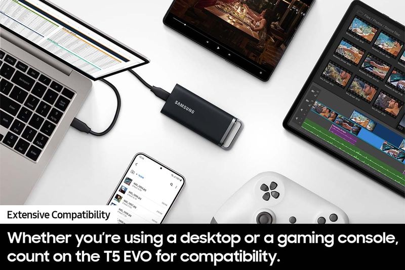 Se adapta a todas las necesidades: ya sea que estés utilizando un escritorio, una cámara o una consola de juegos** cuenta con el SSD portátil T5 EVO para una amplia compatibilidad; es un verdadero jugador de equipo cuando se trata de uso de aplicaciones de servicio pesado o ahorro de archivos
