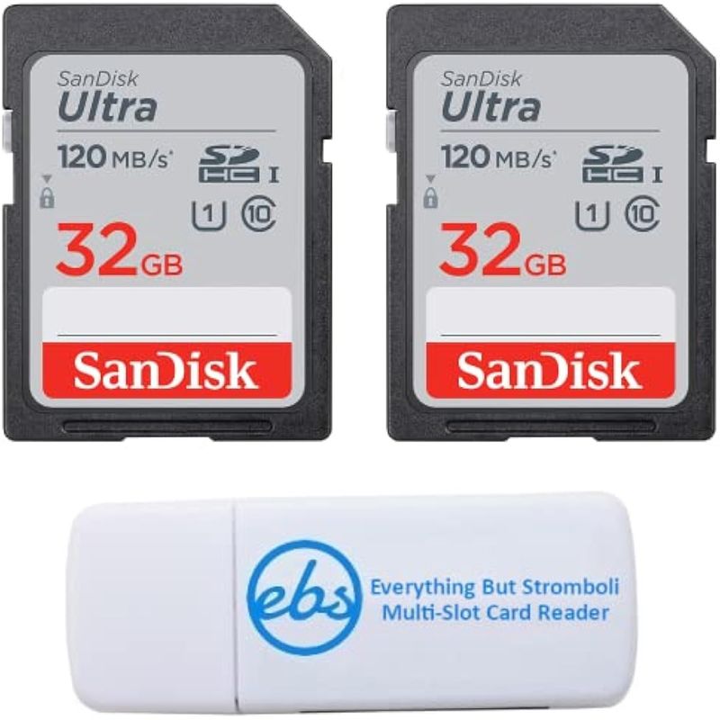 SANDISK TARJETA DE MEMORIA SDHC SD ULTRA DE 32 GB (PAQUETE DE DOS) FUNCIONA CON CANON EOS REBEL T7, REBEL T6, 77D CáMARA DIGITAL CLASE 10 (SDSDUN4-032G-GN6IN) PAQUETE CON (1) LECTOR DE TARJETAS COMBO