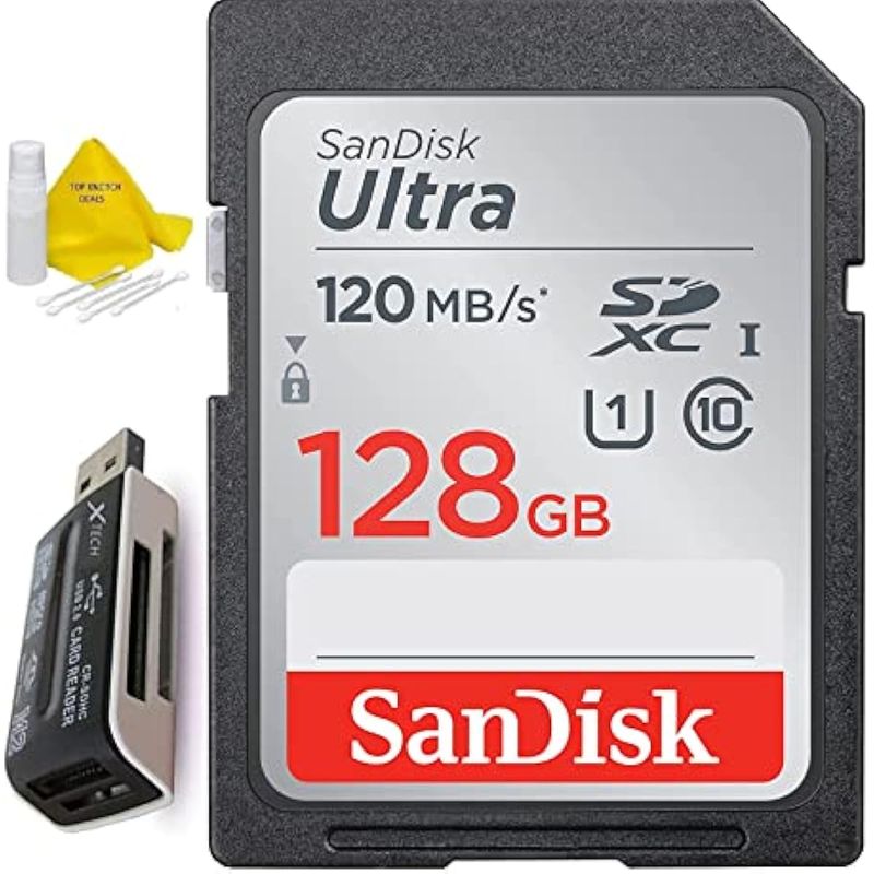 El kit de tarjeta de memoria SD de 128 GB de TopKnotch incluye una tarjeta de memoria SanDisk Ultra Class 10 SD de 128 GB + kit de inicio de cámaras Top Knotch