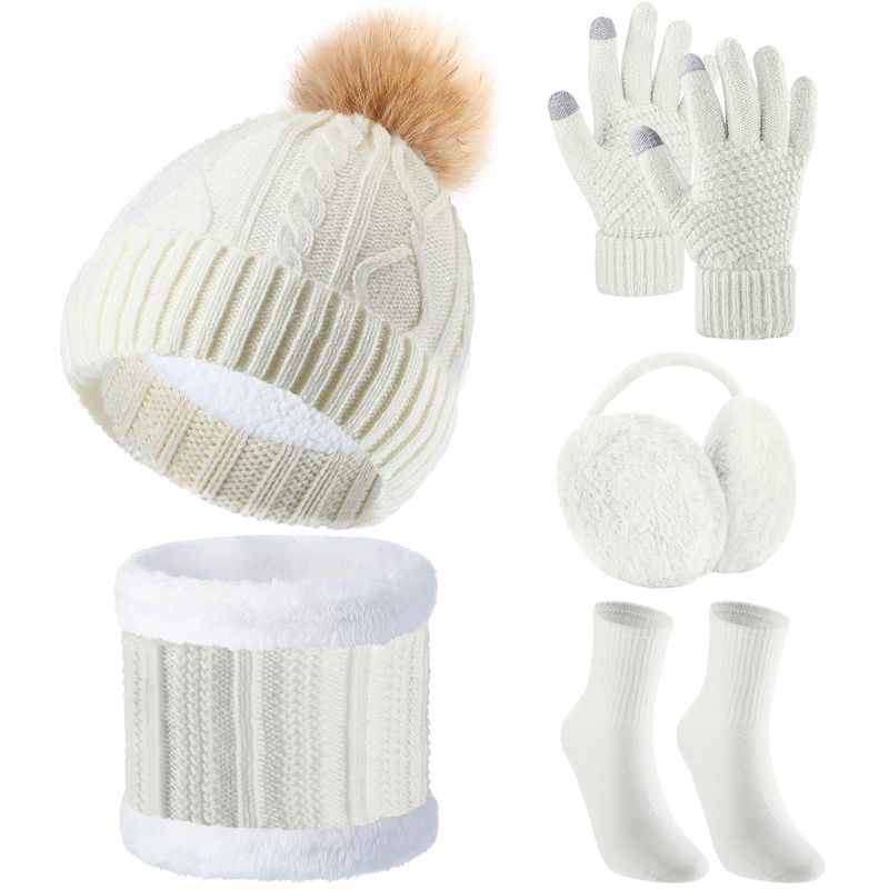 SATINIOR JUEGO DE 5 PIEZAS DE GORRO DE INVIERNO BUFANDA Y GUANTES DE PUNTO GORRO CON POMPóN, GUANTES CáLIDOS PARA PANTALLA TáCTIL, CALENTADOR DE OREJERAS PARA MUJER