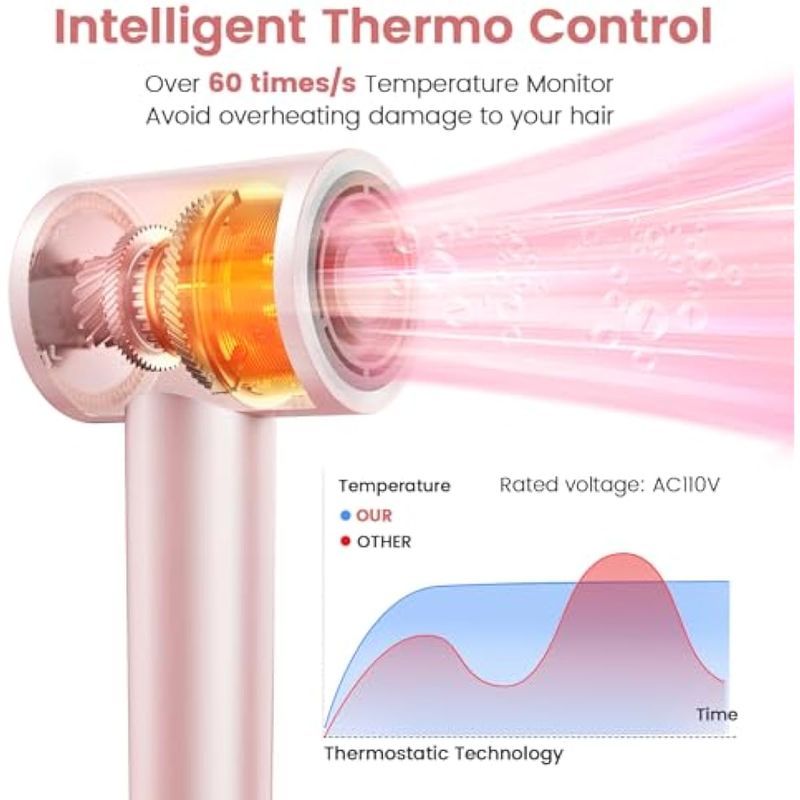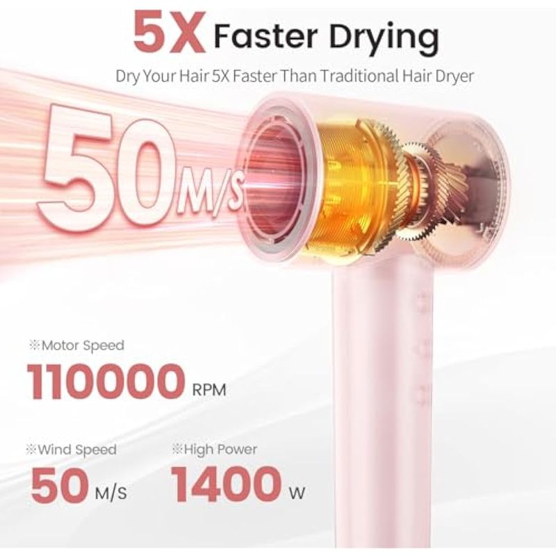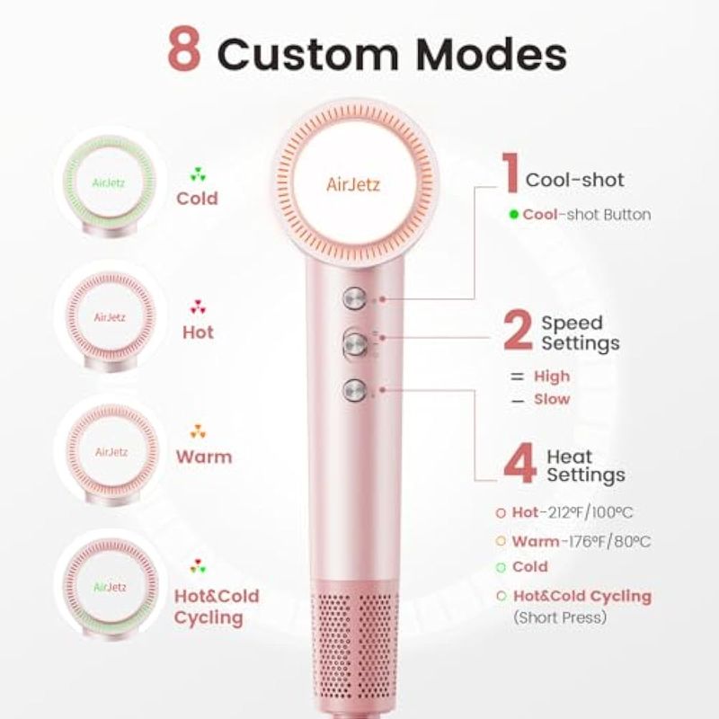 Secado ultrarrápido: el secador de pelo difusor AirJetz está equipado con un motor sin escobillas de alta velocidad de 110,000 RPM, proporcionando una fuerte velocidad de viento de hasta 164.0 fts. Solo tarda 2-5 minutos en secar el cabello, que es 5 veces más rápido que el secador de pelo tradicional, hace que tu rutina de cuidado del cabello sea eficiente y agradable.