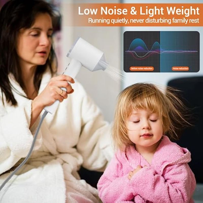 Bajo nivel de ruido y seguro: diseñado con reducción de ruido, nuestro secador de pelo garantiza un funcionamiento silencioso, por lo que no molestará el descanso de tu familia. Para mayor seguridad, la entrada de aire se encuentra en la cabeza, evitando que el cabello se succione y garantiza un flujo de aire suave