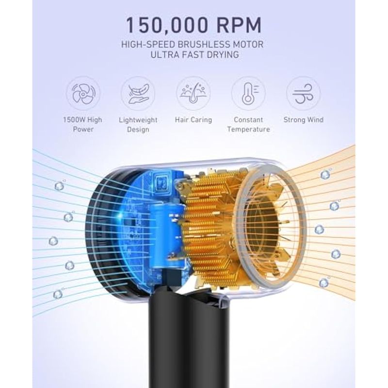 SECADOR DE PELO íONICO NEGATIVO CON MOTOR ELéCTRICO DE ALTA VELOCIDAD SIN ESCOBILLAS DE 150,000 RPM PARA SECADO RáPIDO, SILENCIOSO Y CON CONTROL DE TEMPERATURA, DIFUSOR Y BOQUILLA