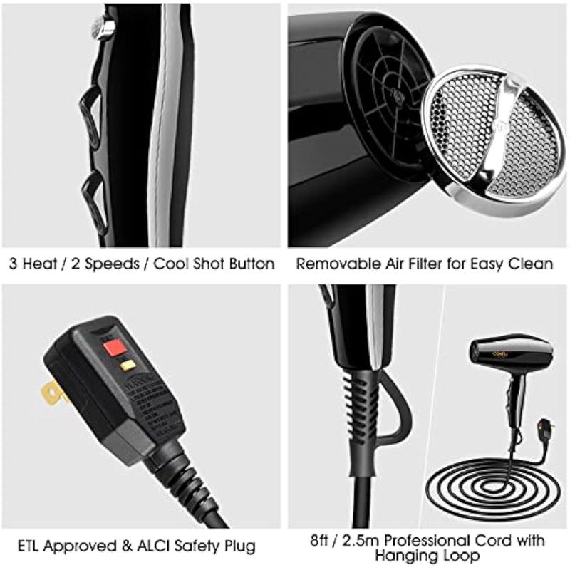 Protección de seguridad contra sobrecalentamiento: el secador de pelo está diseñado con doble circuito de protección y equipado con enchufe ALCI certificado ETL, que proporciona la máxima protección para tu uso seguro, y el filtro de aire se puede quitar y limpiar fácilmente.