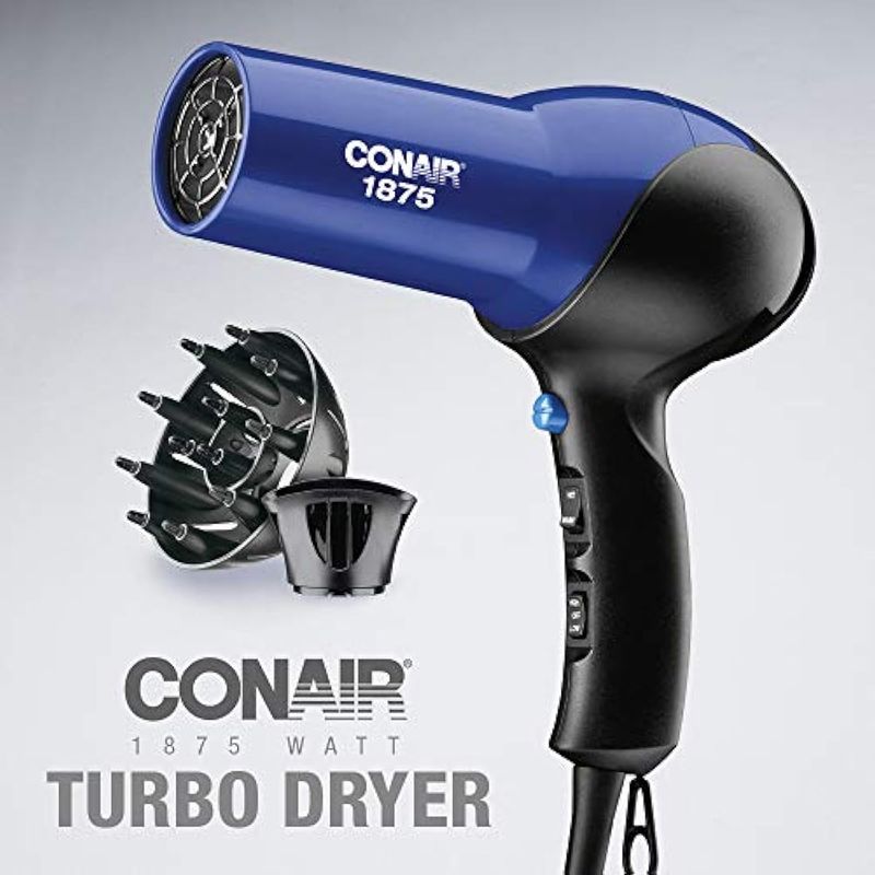 Give your hair long-lasting volume quickly with the sleek and versatile Conair 1875 Watt Turbo Hair Dryer. With excellent heat and airflow driven by the quiet-tone motor, this hair dryer uses turbo action and ion output to boost volume and condition your hair. Dry your hair and help fight frizz with this ionizing hair dryer from Conair. The blow dryer has a sleek, comfortable design and convenient, versatile functions. An out-of-the-way hanging hook simplifies storage. The dryer also features 2 heat2 speed settings and a cool-shot button to lock hair styles in place. Designed to dry hair faster and maximize volume, the diffuser enhances your hair’s natural textures and the concentrator works to bring smooth style to your locks.