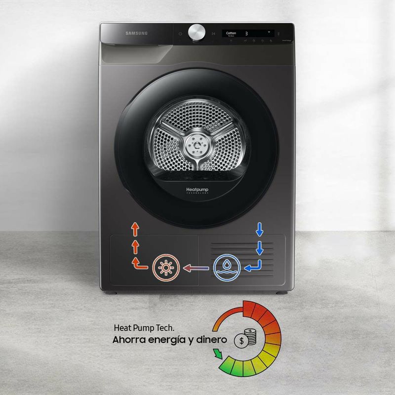 Ahorrá dinero y protegé el medio ambiente usando menos electricidad. La tecnología de bomba de calor ofrece una forma energéticamente eficiente, rentable y suave de secar la ropa. Utiliza 'refrigerante' en lugar de electricidad para calentar el aire y recicla el aire caliente para evitar el desperdicio de energía